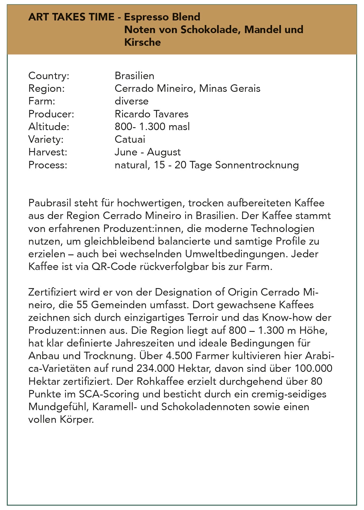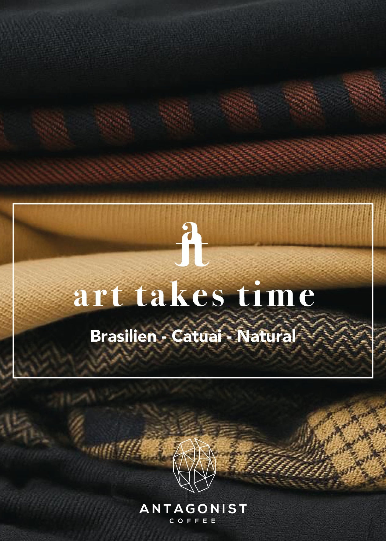 Dieser Espresso ist das Ergebnis der Zusammenarbeit vom Modelabel art takes time und Antagonist Coffee. Er vereint brasilianische Kaffeetradition mit der Überzeugung, dass gute Dinge Geduld brauchen – ob Kunst oder Kaffee.