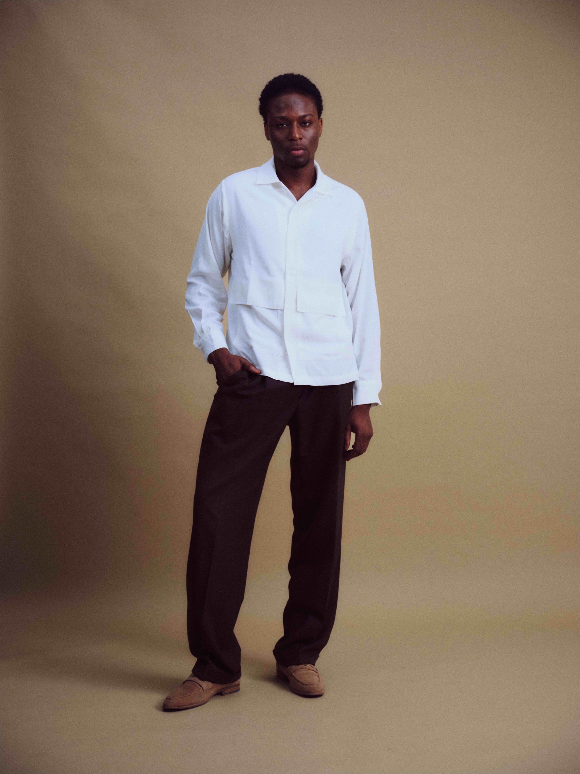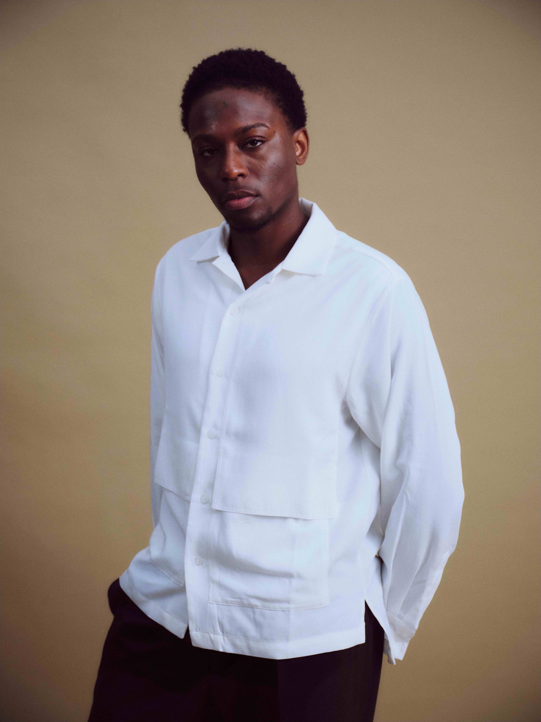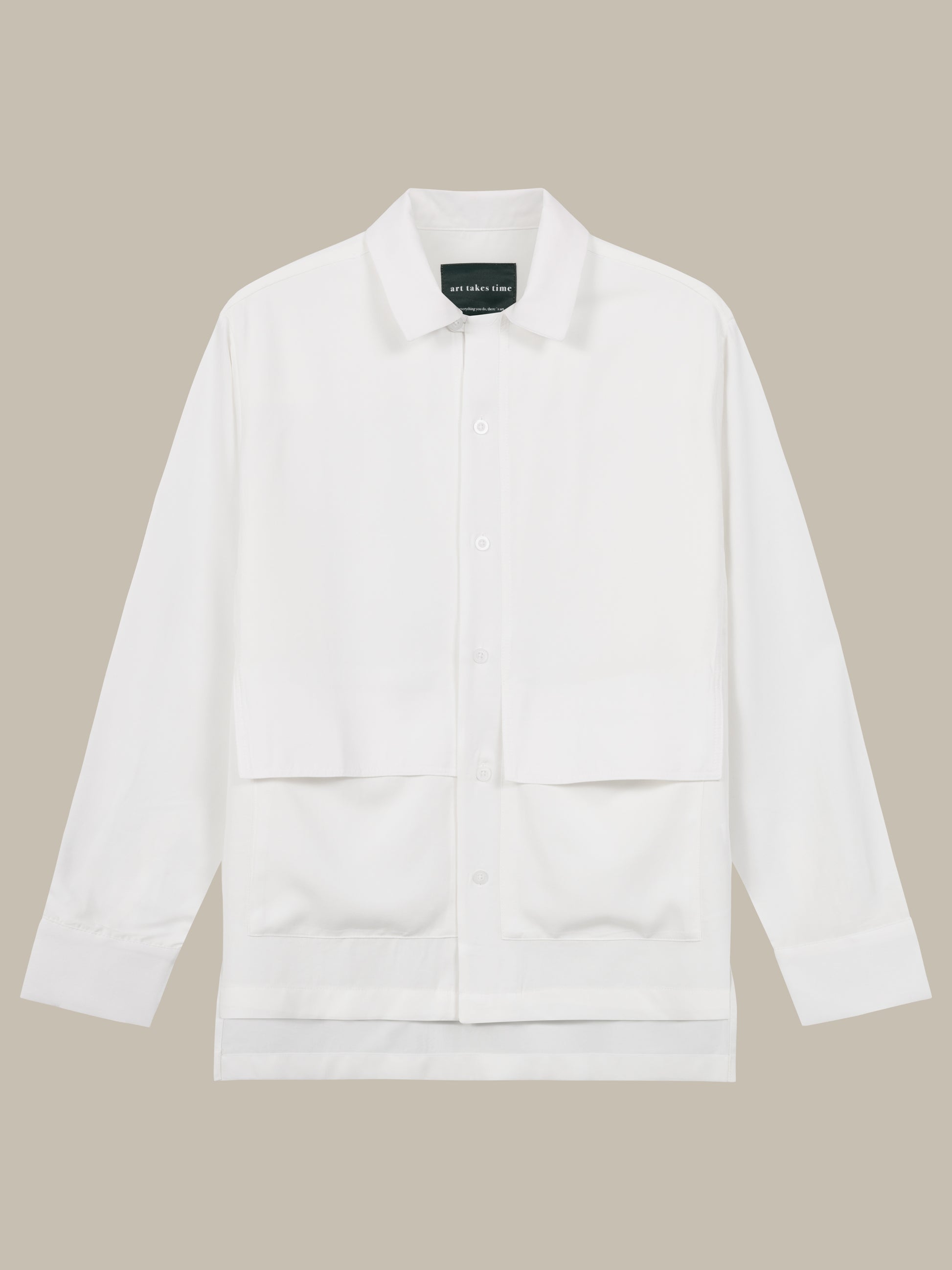 A white long-sleeve shirt with button closure, featuring two lower pockets and detailed stitching. Designed with a relaxed fit and made from soft Tencel fabric for a luxurious touch and feel.