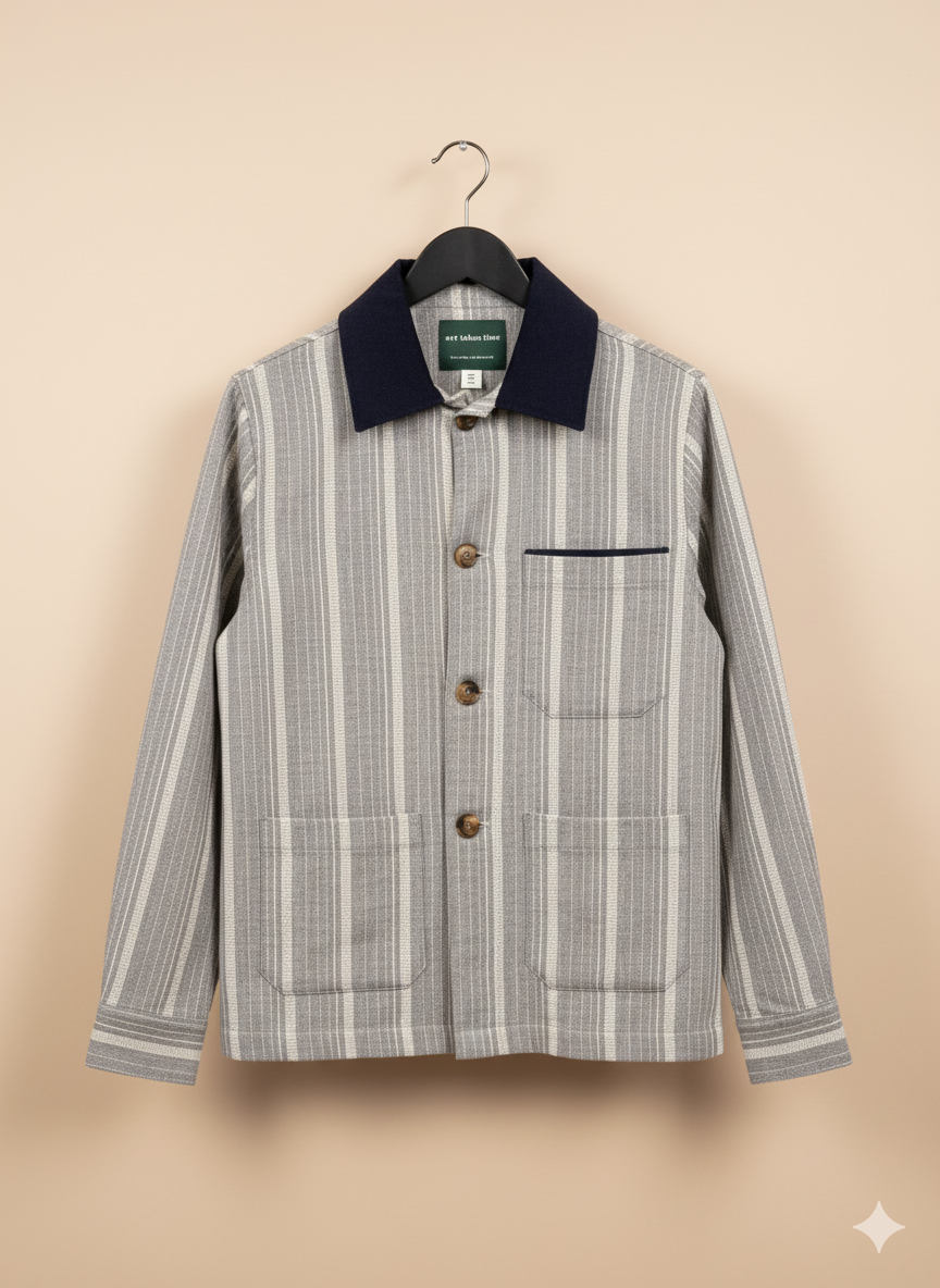 A timeless overshirt reimagined – crafted from a refined striped fabric and finished with a striking navy contrast collar. Multiple exterior pockets add both function and character, making this piece a versatile layer that blends classic tailoring with a modern, utilitarian edge.